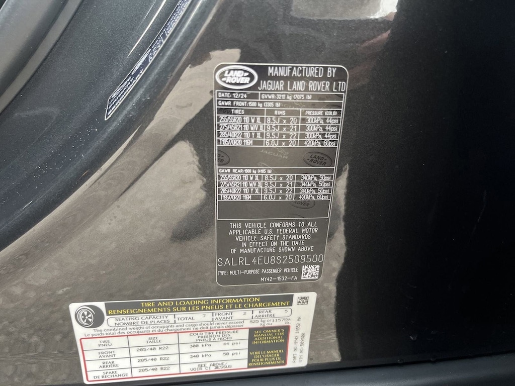 COLD CLIMATE PACKAGE -inc: Heated Windshield, 60:40 Heated Electric Folding Rear Seats, manual slide and powered recline, center headrest and armrest, Headlight Power Wash, Heated Washer Jets , PREMIUM INTERIOR PROTECTION PACK -inc: Rubber Mats, Cargo Carrier, Loadspace Mat, LAND ROVER HANDOVER PACK, HEATED ELECTRIC INTELLIGENT FOLD 3RD ROW SEAT PACK -inc: Intelligent Seat Fold, Heated Electric Third Row Seats, EMERGENCY PACK -inc: basic first aid and roadside emergency supplies, EBONY, WINDSOR LEATHER SEAT TRIM, CARPATHIAN GREY PREMIUM METALLIC, 20-WAY HEATED & COOLED ELECTRIC FRONT SEATS -inc: captains armrest and driver memory, Wheels: 21" Gloss Black -inc: Style 5025, Trunk/Hatch Auto-Latch.